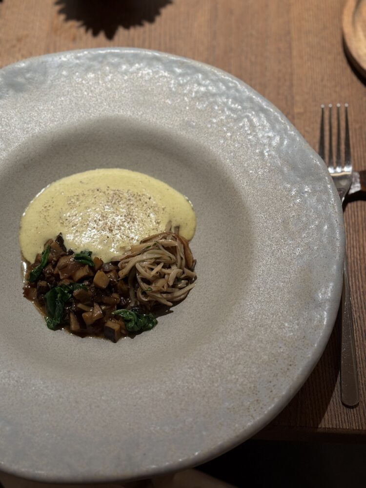 Si comincia con un piccolo aperitivo vegetale ideato da Francesca: una tartelletta con mousse di funghi e miglio soffiato, un “cinnamon roll” di scarole cotto a vapore e glassato all’uvetta e salsa di soia, un mini dog con fagiolini alla brace, barbecue allo zenzero, maionese alla mostarda e cipolla croccante. Tre assaggi che aprono al viaggio, sintesi perfetta di leggerezza, curiosità e tecnica.