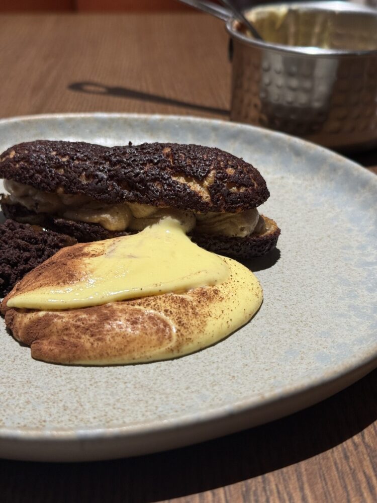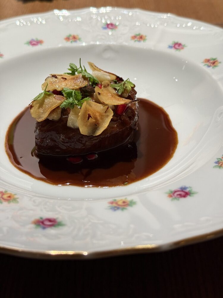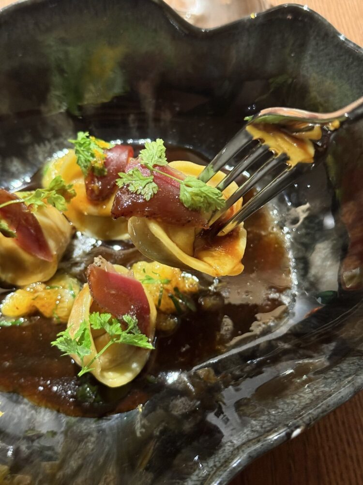 Il tortello d’anatra con prosciutto di petto, arancia a vivo e jus riporta la cucina al suo respiro più classico, tra intensità e misura. Il percorso si chiude con dolci che hanno il sapore dell’infanzia e la grazia del mestiere: il tiramisù gourmand, la crème brûlée al mais con popcorn caramellati e quel pane e mela che profuma di cognac e di casa.