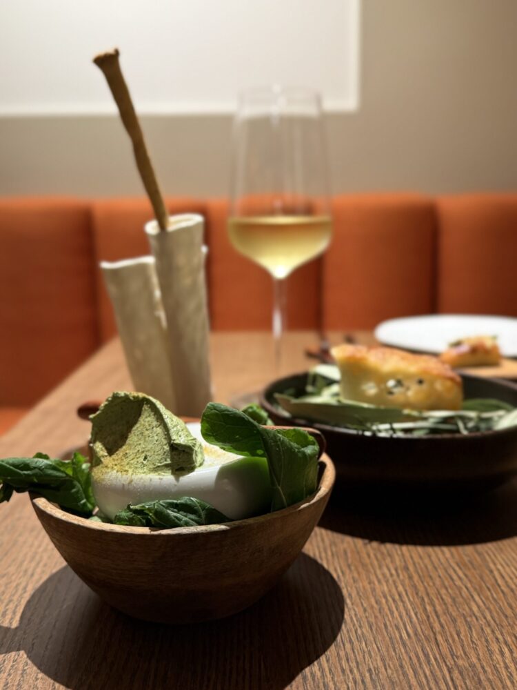 Poi arriva il pane, che qui è tutt’altro che un accompagnamento: focaccia all’origano, grissini ai semi e burro aromatizzato alle foglie di rapa e finocchietto selvatico. Un gesto semplice ma simbolico, il primo incontro tra la terra e la tavola, tra la tradizione e l’idea contemporanea di ospitalità.