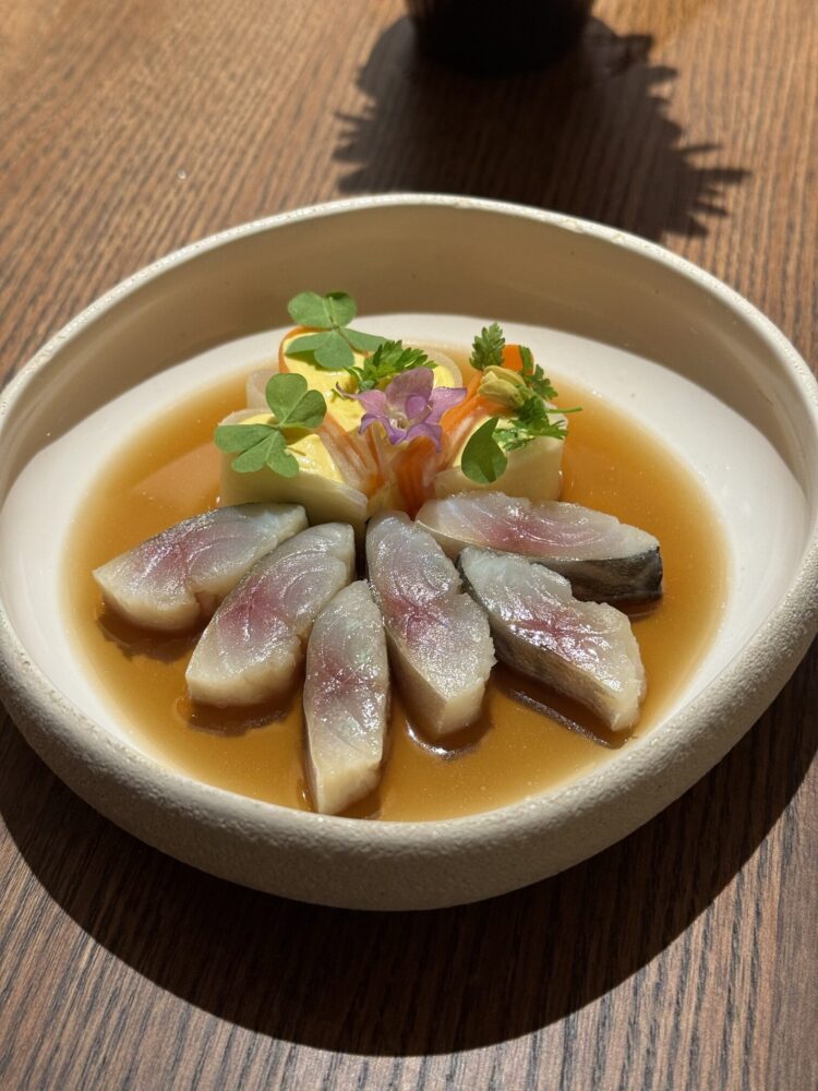 Il menu riflette la stessa filosofia: pochi piatti, mirati, essenziali. Lo sgombro marinato all’aceto di riso, con la sua trasparenza e la leggerezza del consommé di volatili, è un inizio che profuma di mare e di calma.