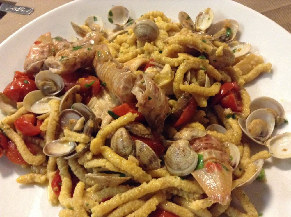 Oltre ai passatelli, con aglio olio prezzemolo, peperoncino e qualche pomodorino (la base per una buona riuscita di un piatto di pasta col pesce) c’è solo (si fa per dire) pesce autoprodotto dal vicinissimo Adriatico, canocchie a pezzi per dar sapore (e che sapore) al sugo, la polpa delicata di piccole sogliole che non si sono nascoste abbastanza bene nella sabbia e le piccole e saporitissime, senza il rischio del gommoso (e senza l’accenno di un granello di sabbia), vongole dell’Adriatico, le stesse che in una semplice zuppetta mostrano i segni evidenti di un piatto intramontabile da gustare preferibilmente dopo il tramonto assieme a un bel calice di bollicine.