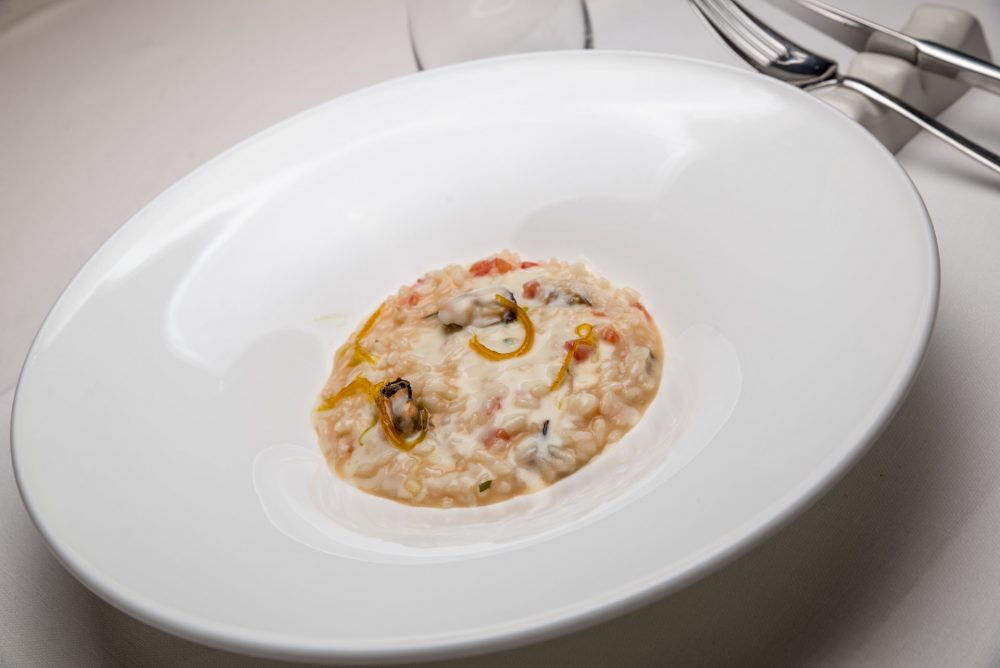 Risotti di Massimo Carleo – cozze con pomodoro al basilico-salsa affumicata-arancia candita
