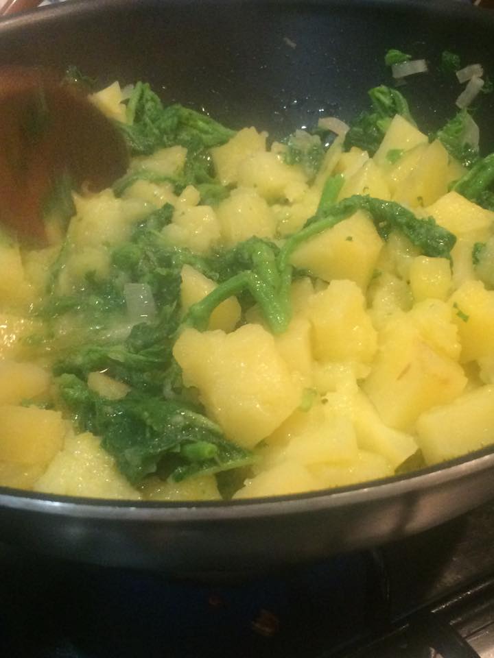 Prima che le patate inizino a sfaldarsi, recuperatele aiutandovi con una schiumarola e unitele ai talli. Salate e lasciate insaporire il tutto per cinque minuti.