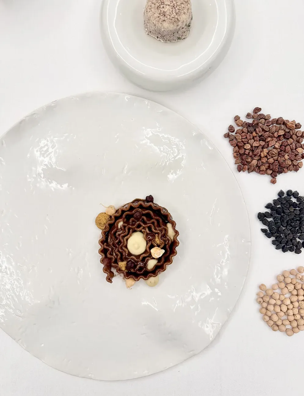 Cuocere le mafaldine in abbondante acqua salata per 3 minuti e terminare la cottura in padella con il brodo di ceci neri per 12 minuti. Mantecare con l’olio e il conciato plant based stagionato. Sul piatto, effettuare degli spuntoni con la crema di pasta e ceci bianchi e la purea di ceci rossi fermentati. Posizionarci sopra la mafaldina arrotolata ed effettuare altri spuntoni. Aggiungere qualche cece rosso fermentato intero e i ceci bianchi germogliati.