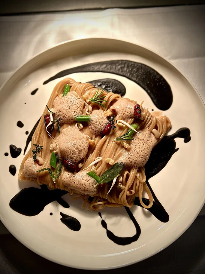 Effettuare degli schizzi sul piatto con la crema di fagiolo nero; “pettinare” gli spaghettini con una pinza e posizionarli sopra gli schizzi di fagiolo nero, a voler ricreare un rettangolo e disporre in ordine sparso il resto delle preparazioni. Emulsionare l’aria di lardo e posizionarla, con l’aiuto di un cucchiaio negli spazi liberi rimasti.