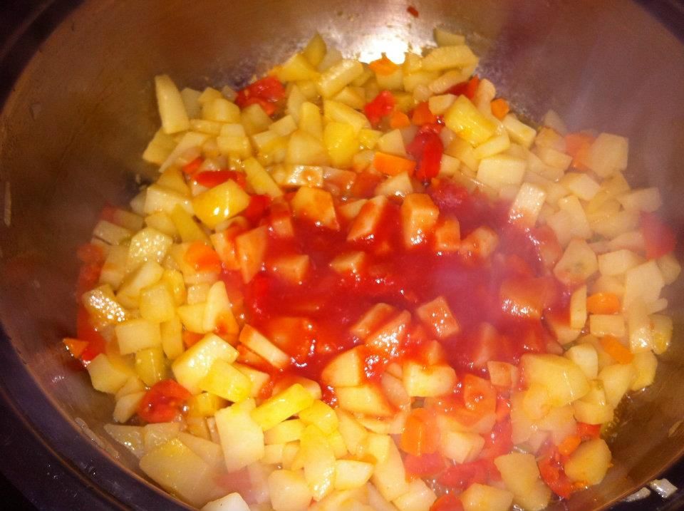 Versare nel composto la passata e i pomodorini precedentemente tagliati a pezzetti e lasciar andare a fuoco lento per qualche minuto.