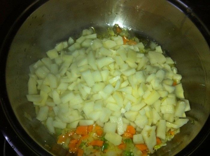 Preparare un battuto di sedano, carote e cipolla e far rosolare in un tegame con olio d'oliva. Pelare le patate e tagliarle a cubetti, aggiungerle al trito.