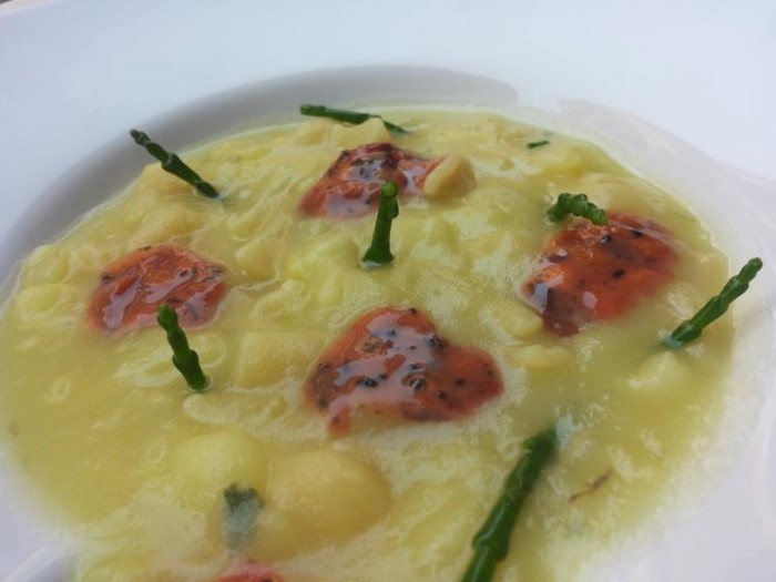 Sbucciare le patate e tagliarle a cubetti, fare un fondo con cipolle tritate, sedano, olio extravergine, uno spicchio d'aglio, alloro e basilico, far rosolare le patate, bagnare con brodo vegetale e portare a termine la cottura. Cuocere la pasta mista nel composto girando spesso in modo tale da formare una cremina; una volta pronta la pasta e patate adagiarla in un piatto e finire con ricci di mare e ciuffetti di salicornia.