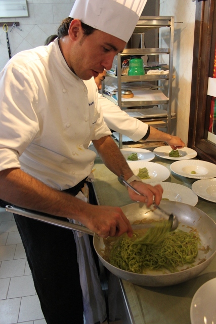 Dove in trasparenza nelle fettucce si intravede la polpa dei piselli e lo scalogno prende il posto del cipollotto novello.