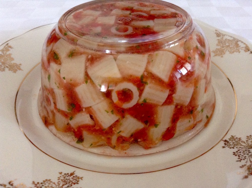 Amalgamare secondo il proprio gusto pasta e salsa,(se dovesse avanzare del sugo potrà servire per preparare un gustoso aperitivo: crostini caldi di pane toscano tostato e salsa fredda) riempire, pressando bene, un contenitore a forma di cupola, una ciotolina mono porzione o una zuppiera e lasciare in frigo almeno un quarto d’ora.