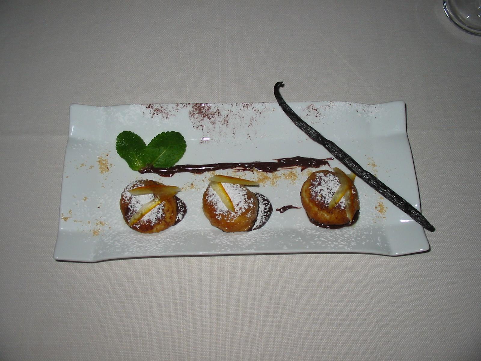 Nel frattempo, a parte, frullate nel mixer dieci biscotti secchi da latte e ottenere una polvere. Con il composto così ottenuto, preparate delle palline del diametro di tre centimetri; imprimerle prima nel tuorlo d’uovo (precedentemente sbattuto) e poi nella polvere di biscotti. Passare in padella con burro e spolverare di zucchero a velo fino a che non si ottiene una delicata crosticina. Servire su cioccolato sciolto e aromatizzato con fiori d’arancio. Decorare con foglie di menta e servire ben caldo.
