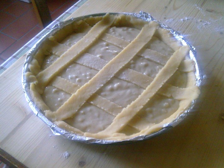 Foderate uno stampo a bordi bassi,con la frolla precedentemente fatta,versatevi la crema ottenuta(sarà abbastanza liquida ,nn temete) sopra adagiatevi delle striscioline di pasta frolla ritagliate tipo quelle delle crostate.