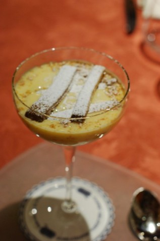 In una coppa o in un bicchiere basso svasato porre sul fondo un po’ di biscotti tritati (che fungono da croccante) e coprire con un mestolino di crema ottenuta. Ripetere nuovamente la sequenza.