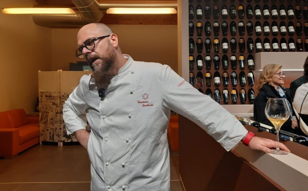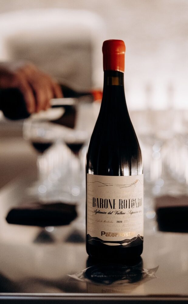 Si risale in superficie verso la serata di gala nella sede centrale di Paternoster. Prima dei piatti dello chef Vitantonio Lombardo, una stella michelin a Matera, ecco la verticale del Don Anselmo “l’essenza del Vulture tra eleganza e profondità”. Tre annate recenti ed una emozionale, un confronto tra il prima e il dopo l’avvento di Tommasi Family Estates nel 2016 e del cambiamento climatico qui solo in parte influente. Un vino iconico, nato nel 1985, riconosciuto e celebrato fin da subito dalle migliori guide di settore. Infine, la presenza di ceppi madre del 1969 nel vigneto singolo di 4 ettari, selezione massale per i rimpiazzi e vinificazione classica con follature, delestage e sosta in legni grandi di rovere di Slavonia per 12 mesi, oltre 3 anni di bottiglia.