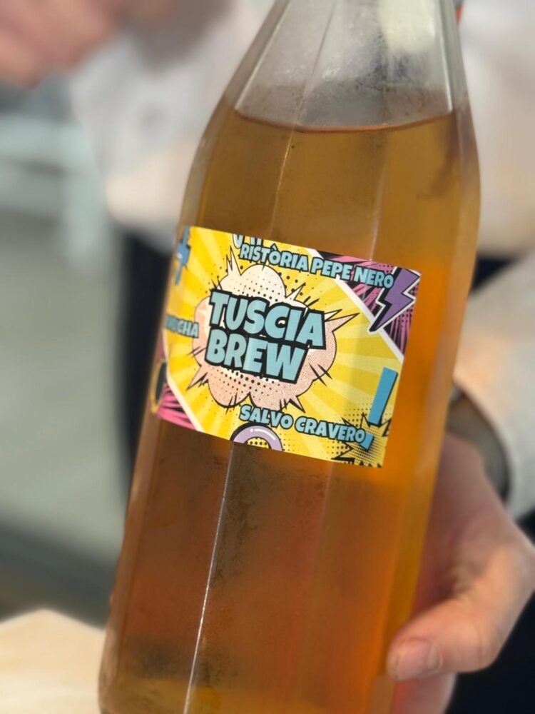 Entrè di Benvenuto accompagnato dalla nostra Kombucha “Tuscia Brew”. Che inizio scoppiettante questo. La Kombucha è divertentissima e ben si abbina ai primi bocconcini.