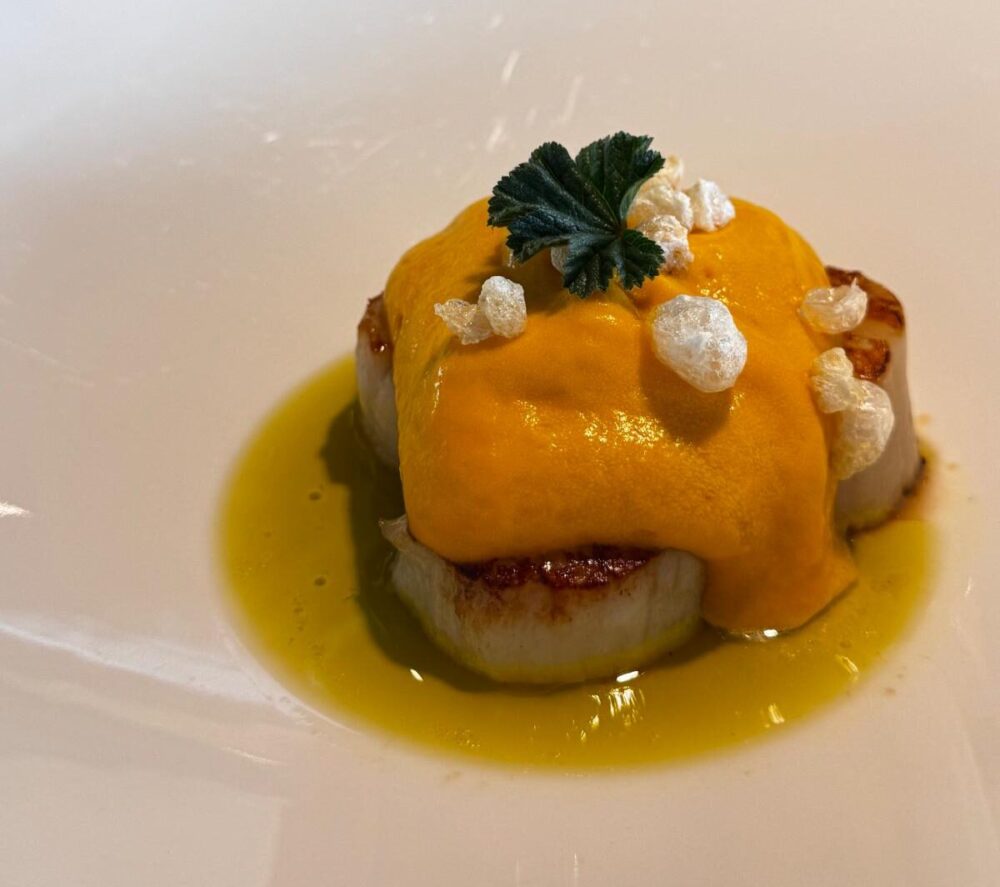 Cappesante con spuma di zucca, olio alla mentuccia e pop corn di maiale. La cremosità e la dolcezza di questo piatto creano un piacevolissimo contrasto con il pop corn di maiale che “sfriccica” sotto i denti.