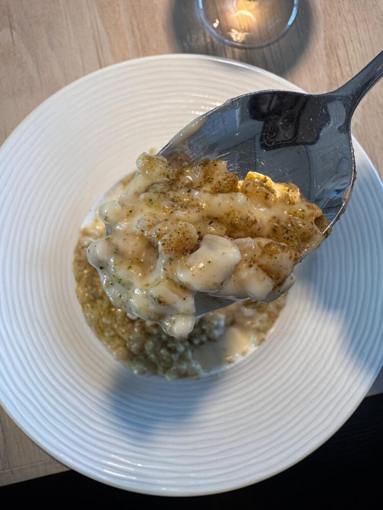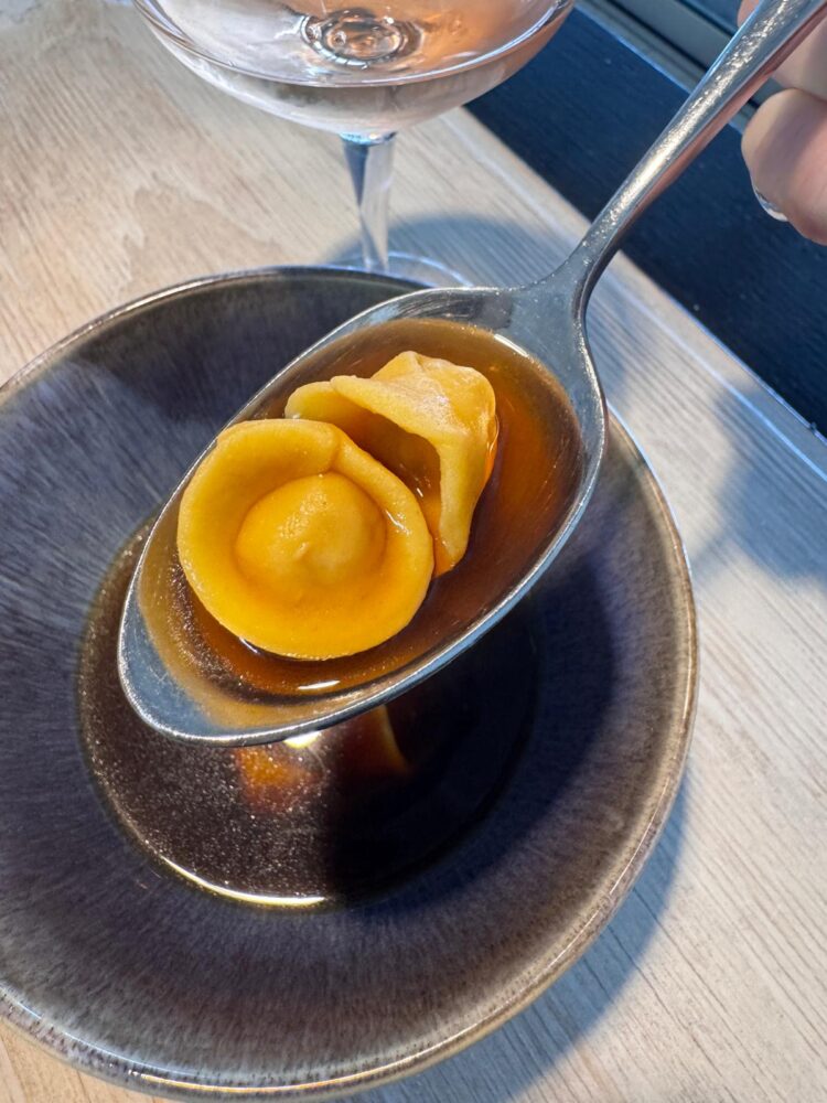 Con i cappelletti 40 tuorli, ripieno di rana pescatrice e patanegra in brodo dashi ho un po’ litigato mentalmente all’inizio. Perché la mente è andata al brodo classico e invece, sorpresa. Ma che sorpresa. Il lungo respiro che dà il brodo dashi ha spento i pensieri più invadenti.