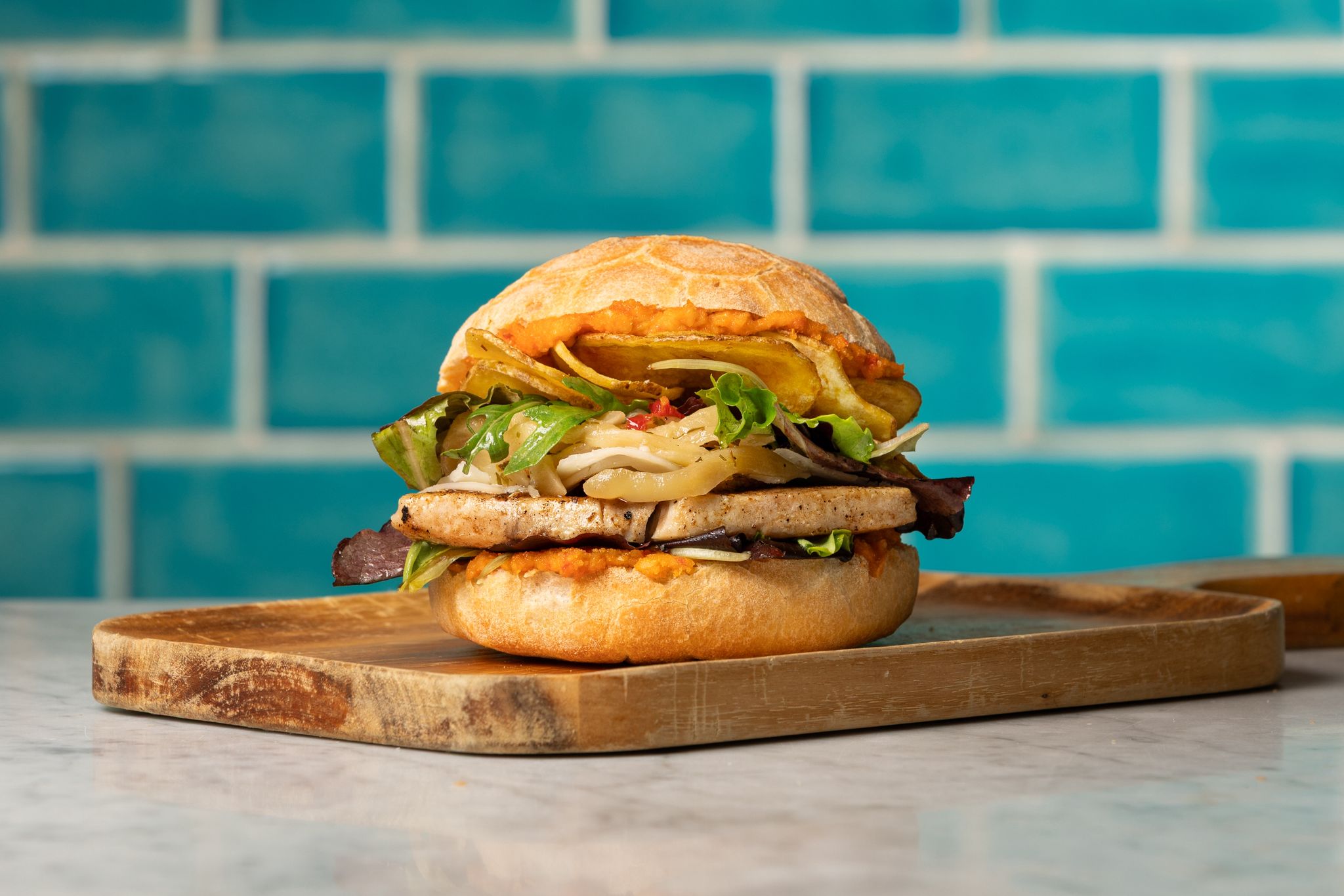 Inossidabile il Panino bistecca di spada: pesce spada, pesto trapanese, melanzane sott’olio, chips di patate e formaggio caprino.