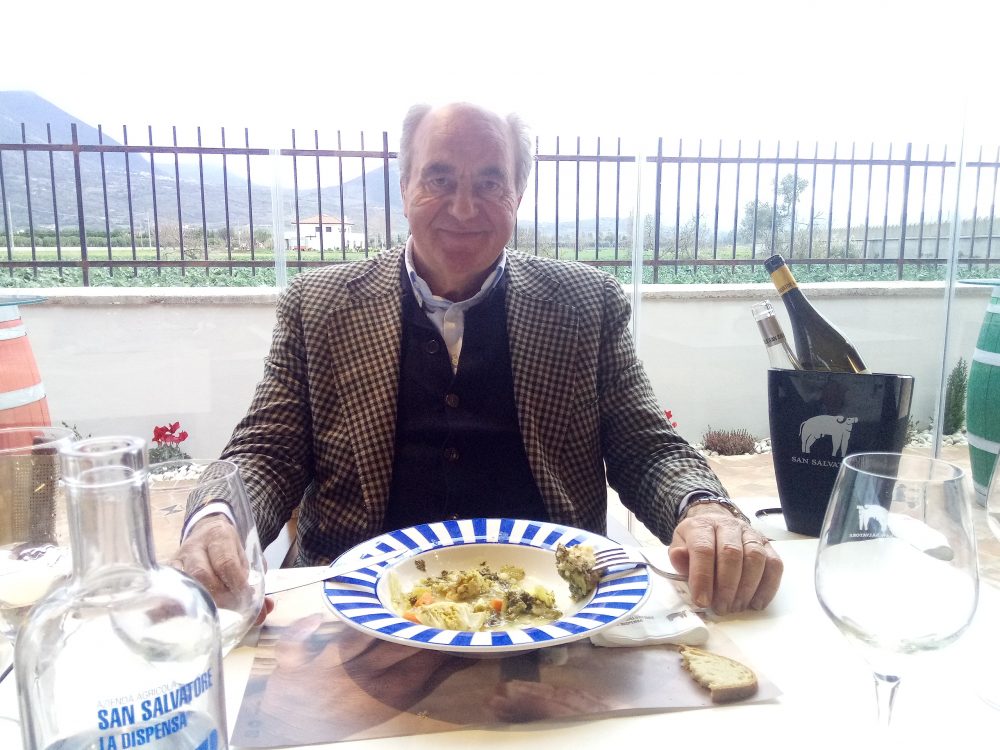 Ci troviamo seduti uno di fronte all’altro alla Dispensa, la penultima sua “creatura” (almeno per adesso, perché a breve potrebbe essere la terzultima conoscendo bene il carattere vulcanico di Peppino). Si mangia e si beve in allegria e si parla del più e del meno. Mi racconta candidamente un po’ di roba, a cominciare dalla sua infanzia trascorsa in quel di Boscoreale, proprio sotto il Vesuvio, dov’è nato e cresciuto. Suo padre, del quale ne parla con grande rispetto e venerazione com’è giusto che sia, faceva il coltivatore e vendeva uva ed olio. In questo modo ha imparato a conoscere la terra e ad innamorarsene. Dopo alterne vicissitudini, giovanotto si è trasferito nel Cilento, terra natìa della madre, e da qui è iniziata la sua “nuova” vita, perché si è sposato con una bella ragazza cilentana, avvicinandosi man mano al mondo dell’imprenditoria e dell’ospitalità. Nel 1980 ha rilevato la gestione dell’hotel Schuhmann, posizionato proprio sulla spiaggia di Paestum, dall’omonimo proprietario teutonico e frequentato massicciamente proprio da turisti tedeschi che ivi sostavano molti mesi all’anno attratti dal clima mite e dal mare limpido. Alcuni anni dopo sono stati acquisiti l’Esplanade ed il Savoy Beach (nome mutuato dal Savoy di Londra e non certamente riferito alla Casa Savoia), diventati in breve tempo prestigiosi punti di riferimento di accoglienza dell’intera area pestana. E la storia continua poi fino ai tempi nostri con la creazione dell’Azienda Agricola e Vinicola San Salvatore (intitolata alla memoria del padre), dedita alla produzione agroalimentare, al vino, all’olio ed a prodotti caseari, derivanti dall’allevamento bufalino. E poi ancora la Dispensa ed il lido Beach Club 93, di recente costruzione.