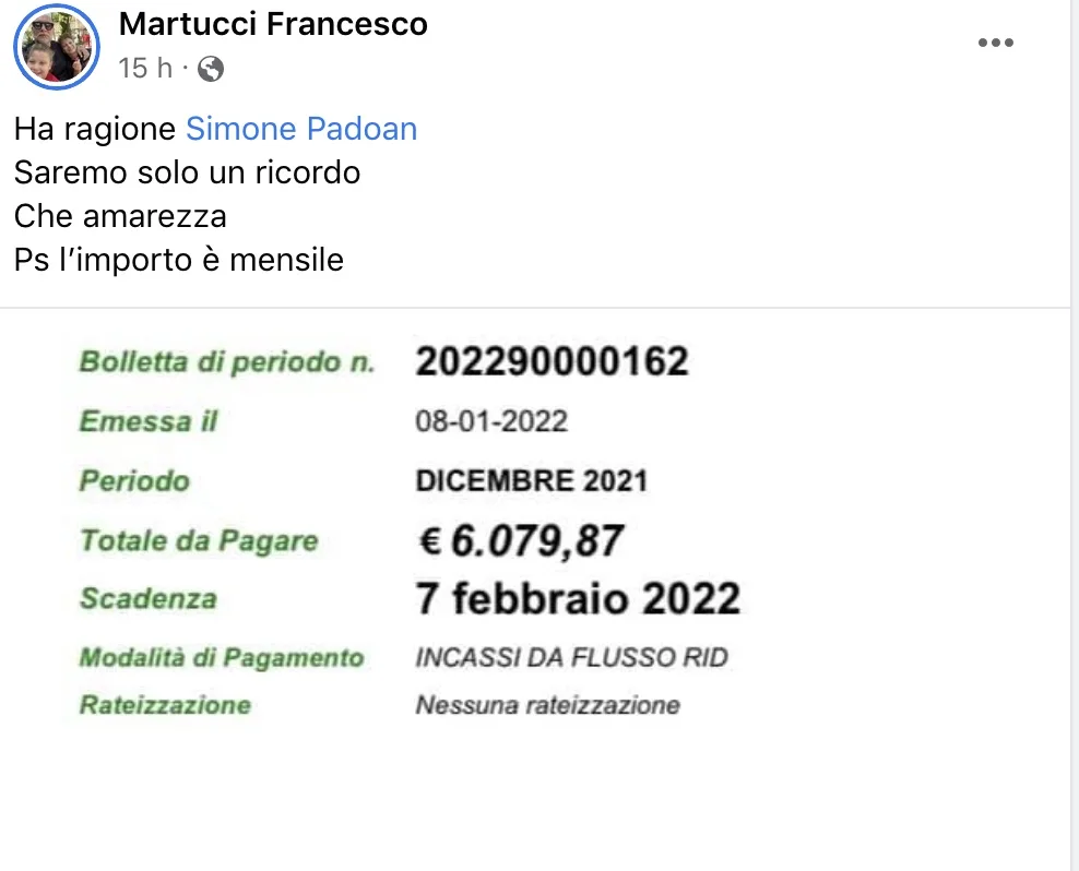 Martucci bolletta 18/1/2022 Torna a: Per pagare la bolletta elettrica ogni pizzeria deve lavorare un week end al mese se va bene, una settimana intera se va male. La protesta di Padoan e Martucci ← Precedente