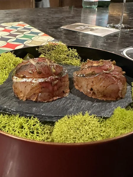 Tonno, caviale e piselli potrebbe sembrare un assemblaggio di ingredienti ed invece è un piatto di grande complessità con una nota leggermente affumicata che rende il tutto delizioso. Intenso e godurioso, molto bello esteticamente il piatto tutto al vegetale con le rape.La Saint Jacques, che non amo particolarmente è giocata su toni acidi e vegetali, sembra quasi l’accompagnamento e non la protagonista del piatto, fantastica così.