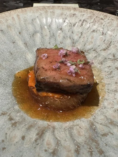 Tre assaggi per il wagyu A5, servito con dei “contorni” che reggono il peso di una carne così importante e gustosa, anche in questo caso è la sensibilità dell’abbinamento a fare completamente al differenza. Tre assaggi per il wagyu A5, servito con dei “contorni” che reggono il peso di una carne così importante e gustosa, anche in questo caso è la sensibilità dell’abbinamento a fare completamente la differenza. Dolci sussurati, freschi e freddi, a pulire il palato.