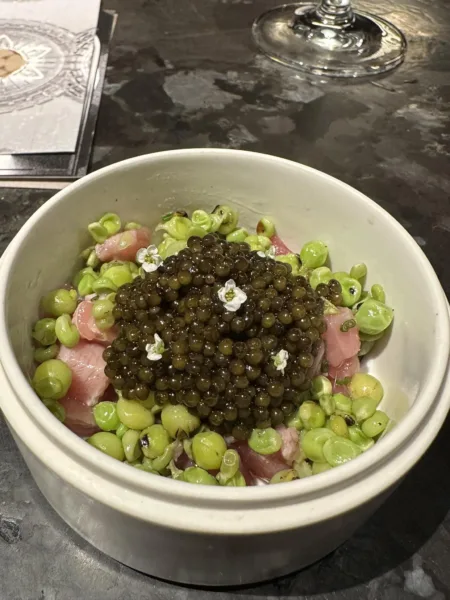 La prima sensazione è di grande accoglienza e di fare tutto il possibile per farti sentre a proprio agio. Quando mangi allo stesso tavolo con persone che non conosci è un poco come tirare alla roulette, non sai mai cosa può uscire, dal miliardario texano con il cappello da cowboy che vuole accompagnare la sua cena con una bottiglia di bourbon, una coppia che festeggia l’anniversario, un’altra coppia di ristoratori che è venuta a vedere che aria tira. Il lavoro iniziale della sala è fondamentale per far sentire tutti a proprio agio, a dare la sensazione che sono tutti lì solo per te e che qualunque siano le tue richieste, dalle intolleranze a cibi che non ami mangiare o cose che vuoi o non vuoi bere, non c’è problema, siamo qui per te.