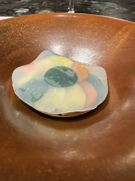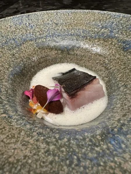 Il cetriolo di mare è ostico come prodotto e nemmeno troppo bello da vedere, ma la cultura coreana aiuta a trasformare questo ingrediente in un piccolo capolavoro, accompagnato da questi “spaghetti” orintali e una salsa che da sola vale il viaggio. Lo sgombro con il king krab e il white kimchi è semplicemente fantastico. Rendere elegante il kimchi è una cosa complicata, Junghyun Park lo fa con grazia ed eleganza, che meraviglia.