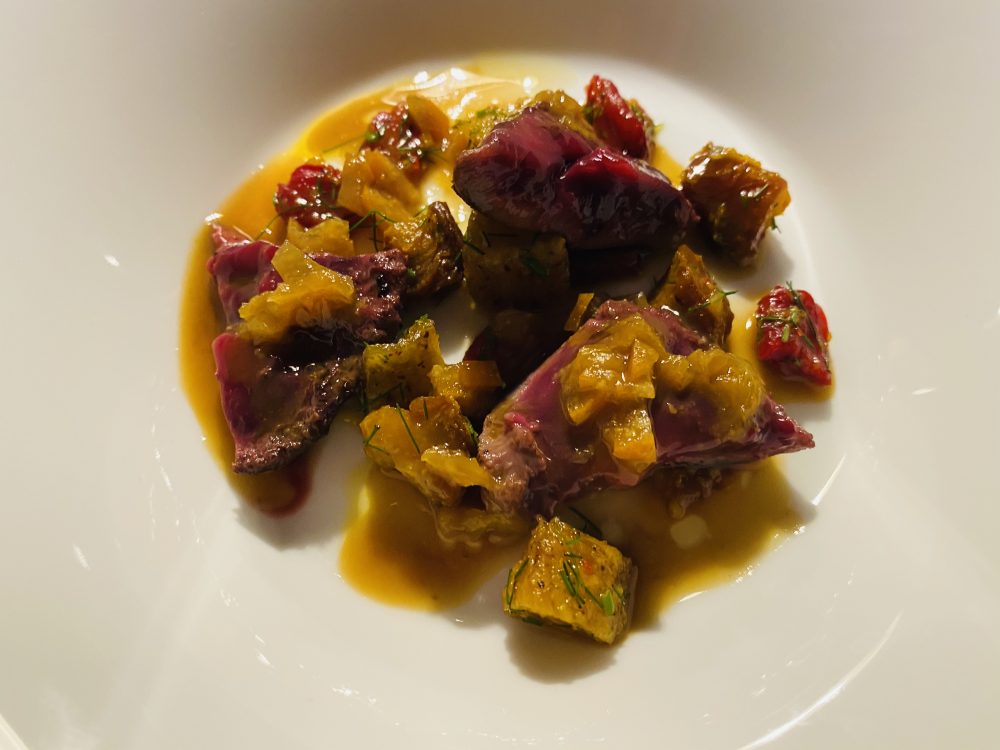 Mauro Uliassi – rognone, brodo di arancia, miso e cannella, albicocche, pesche, peperoni e pomodori essiccati