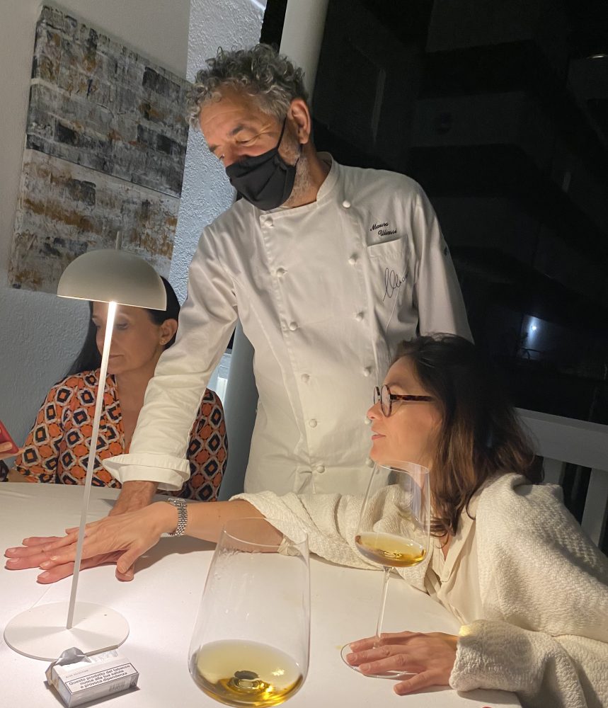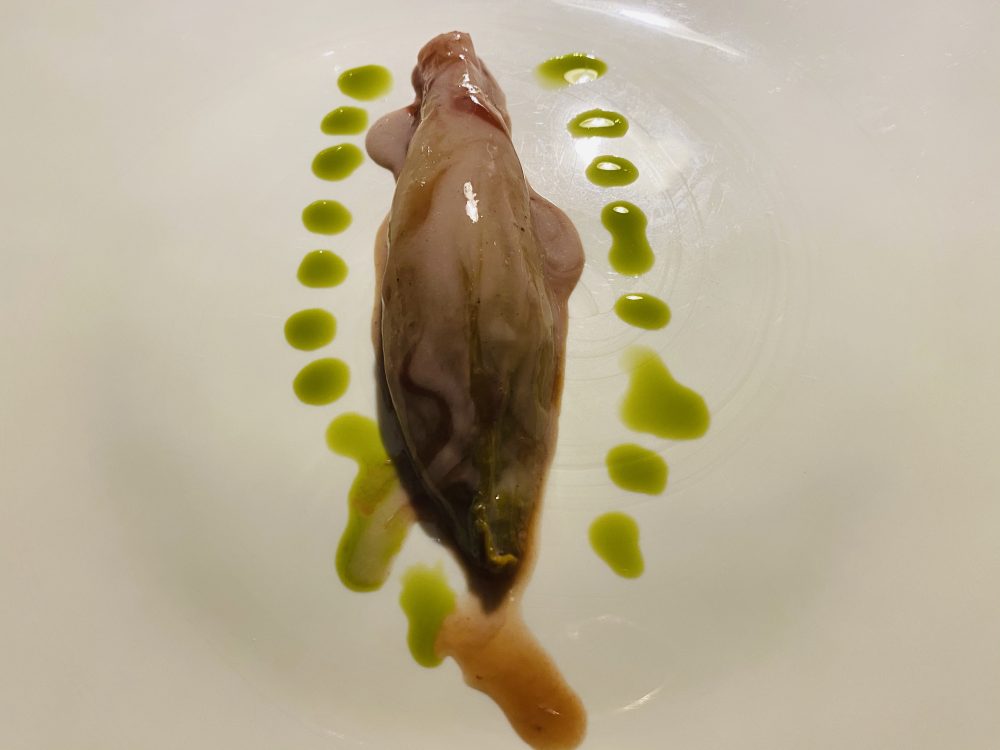 Il linguaggio di Mauro Uliassi è contemporaneo perché nella sua specificità territoriale, fatta di pescato dell’Adriatico, frattaglie e cacciagione di brughiera (quest’anno solo su prenotazione) esalta sapori fragili e forti, acidi, amari, fuoco e ghiaccio, contrasti e armonie, sapidità e dolcezze, non teme di deludere per assenza di rotondità piacione, ma il risultato finale è elettrizzante e armonico al tempo stesso, perché insieme c’è rassicurazione e proiezione. La ricetta è solo sua, di recondite armonie, qualcuno tempo fa mi diceva che il suo gemello diverso Moreno Cedroni sperimentava come un matto seguendo il modello di Adrià quando Mauro era ancora solo un ottimo ristoratore di pesce che faceva banchetti di matrimonio a suon di branzini e fritture, e chissà, forse questa è stata la sua fortuna, essere un po’ più grande di quella generazione di ragazzi terribili della cucina italiana che oggi hanno tutti tra i 52 e i 57 anni e aver sviluppato un linguaggio meno irruento ma totalmente personale con una crescita così verticale.