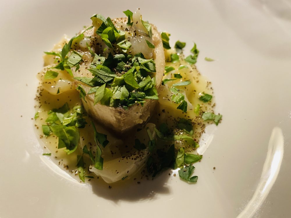 Innanzitutto Mauro Uliassi è sempre e solo se stesso: nell’annus horribilis del covid-confino, in cui Massimo Bottura esce con un cover album ispirato ai suoni e ai colori dei Beatles di “Sgt. Pepper”, Uliassi è così unicamente se stesso da continuare a suonare solo se stesso e si concede una finestra sul mondo solo con un omaggio a Piergiorgio Parini (“sogliola, lattuga, bergamotto”), che è uno che tutti gli appassionati di alta cucina conoscono, ma che nessuno fuori da questa enclave ha mai sentito nominare, che per fare un esempio è come dire che i Led Zeppelin hanno reso omaggio a Jake Holmes, il vero autore di “Dazed and Confused” che nessuno conosce. E, guardacaso, Mauro Uliassi è così se stesso come i Led Zeppelin da titolare il suo percorso annuale sempre “Lab”, a meno che quest’anno non si sia persuaso di aver scritto la sua Stairway to Heaven da presentarsi l’anno prossimo con un titolo tipo The Houses of the Holy, ma non credo, anche perché la sua Stairway to Heaven l’ha scritta l’anno scorso con l’ossobuco di mare che non a caso è presente anche nel lab 2020.