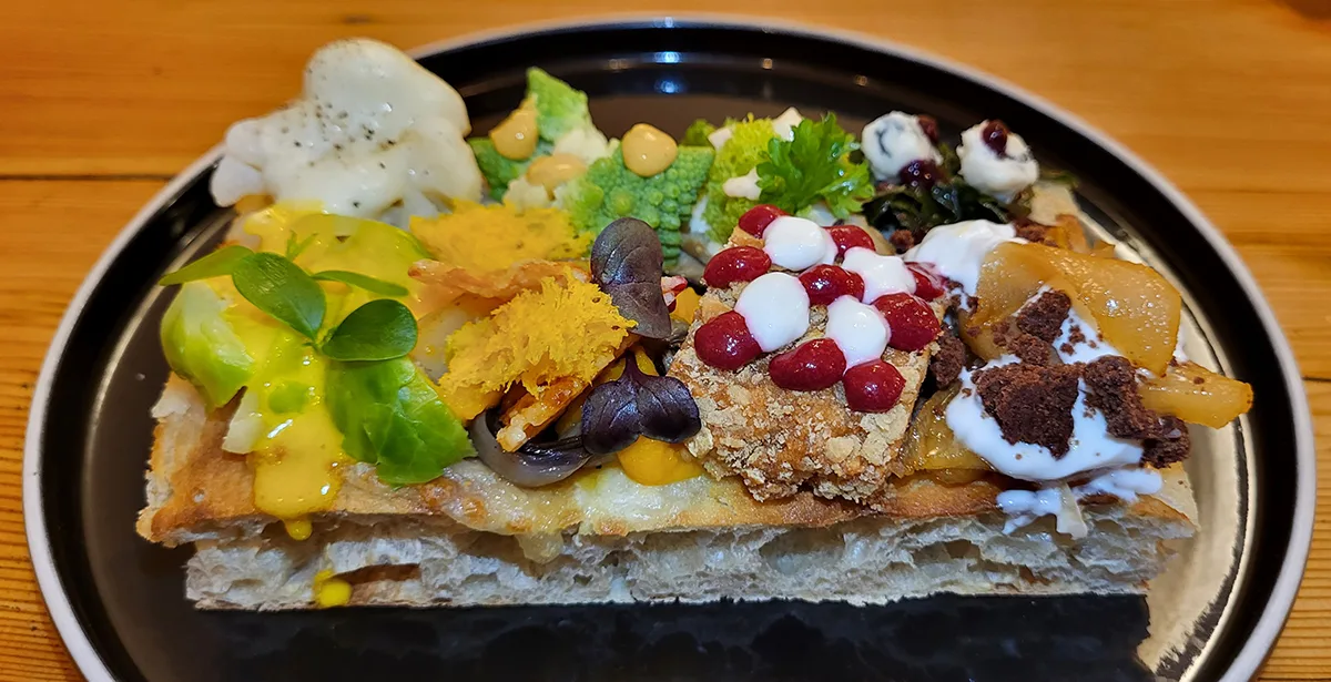 Sbollentare il cavolfiore, il broccolo romanesco e i cavoletti di Bruxelles. Cucinare a vapore il cavolo nero. Nel frattempo, cucinare al forno la zucca, e una volta pronta, frullarla, fino ad ottenere una crema. Brasare il radicchio. Saltare i porcini in padella con aglio e prezzemolo. Tagliare le rape a medaglioni, impastellare e friggere. Da parte, frullare una rapa bollita fino ad ottenere una crema. Caramellare le pere in padella con una noce di burro e abbondante zucchero.