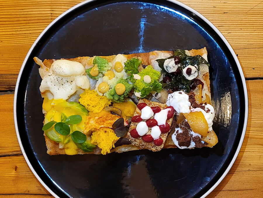 Quadrato 7: su un letto di cavolo nero, apporre 2 pezzetti di Gorgonzola e gocce di gel di mirtillo.