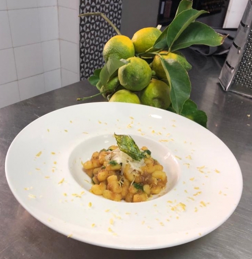 Perle di patate con fonduta di cipolle di Montoro, stracotto di vitellone e bue nero, provolone del Monaco e grattugiata di limone della costiera.