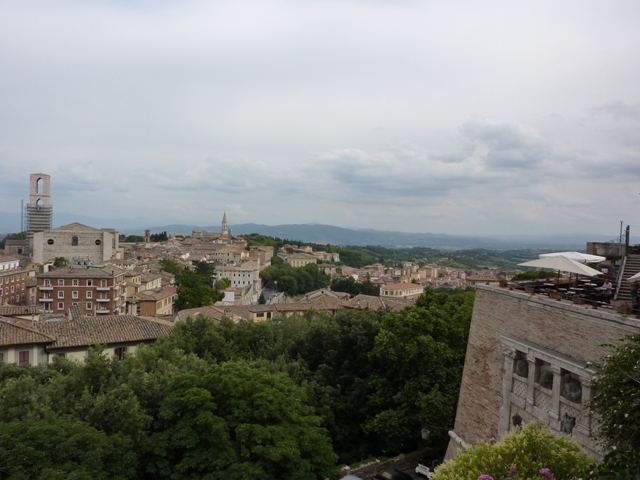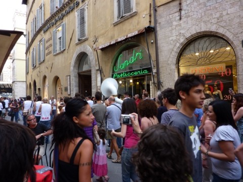 Ma quando i palchi della Fontana Maggiore, dei Giardini Carducci e quelli a pagamento dell’Arena Santa Giuliana aprono i battenti, non c’è crisi che tenga: è festa fino a notte inoltrata. La rassegna che andrà avanti fino a domenica prossima ha inaugurato con il baccano festante dei Funk Off : 20 ragazzoni che danzano e suonano fiati e percussioni trascinandosi dietro una calca composta da centinaia di ragazzi e famiglie. Note, bello e buono a Perugia vanno a braccetto qui. Un bel portale, un cortile con i gerani in fiore, lo scorcio di un vicolo e di una delle “scalinatelle” che portano un piano piu’ in giu’ in questa città verticale in cui scale mobili e salite ripide sono la norma, stimolano la salivazione quanto le vetrine dei bar, delle enoteche, delle gastronomie e delle cioccolaterie. Una grande zona a traffico limitato al quale l’accesso è severamente vietato ai non autorizzati, preserva il centro storico dal caos. Tanti i turisti, ancor di piu’ gli studenti, soprattutto stranieri in giro a piedi. Ma sulla folla è calato un silenzio che al Sud chiamiamo “di stampo nordico”, che altro non è che la capacità assolutamente assente da noi di parlare a bassa voce. Di divertirsi senza arrecare fastidio a chi si diverte anche lui. Passeggiando per il centro, ci si aspetta di ritrovasi soli ad ogni angolo e ad ogni angolo invece, si scopre che c’è un negozietto aperto, qualcuno che passeggia, che fa spesa o che scatta fotografie. Lo stress non sembra esser di casa e il silenzio potenzia la voce dei sensi.