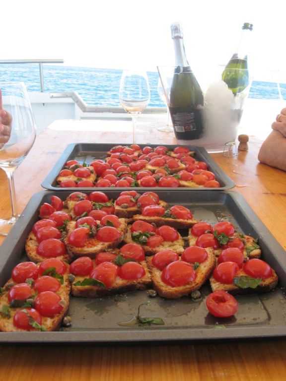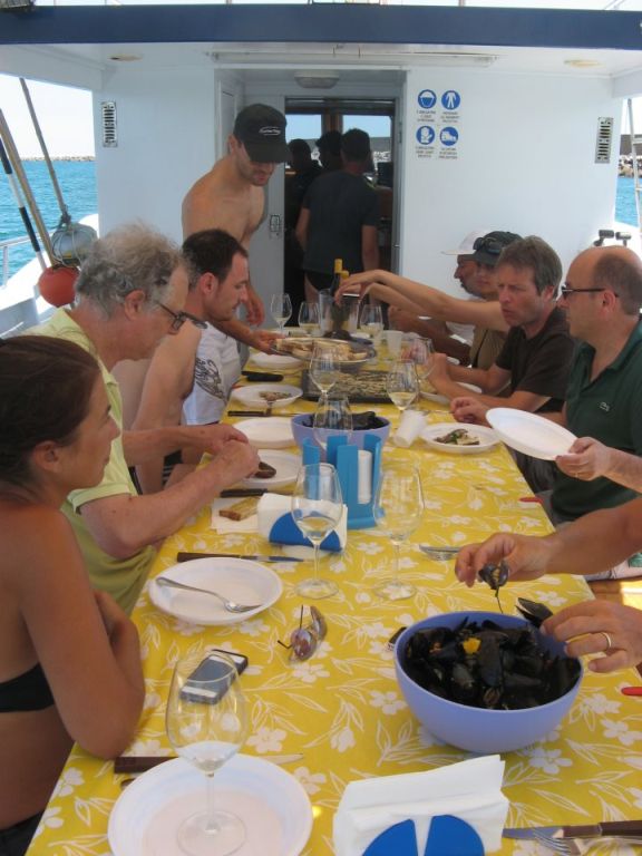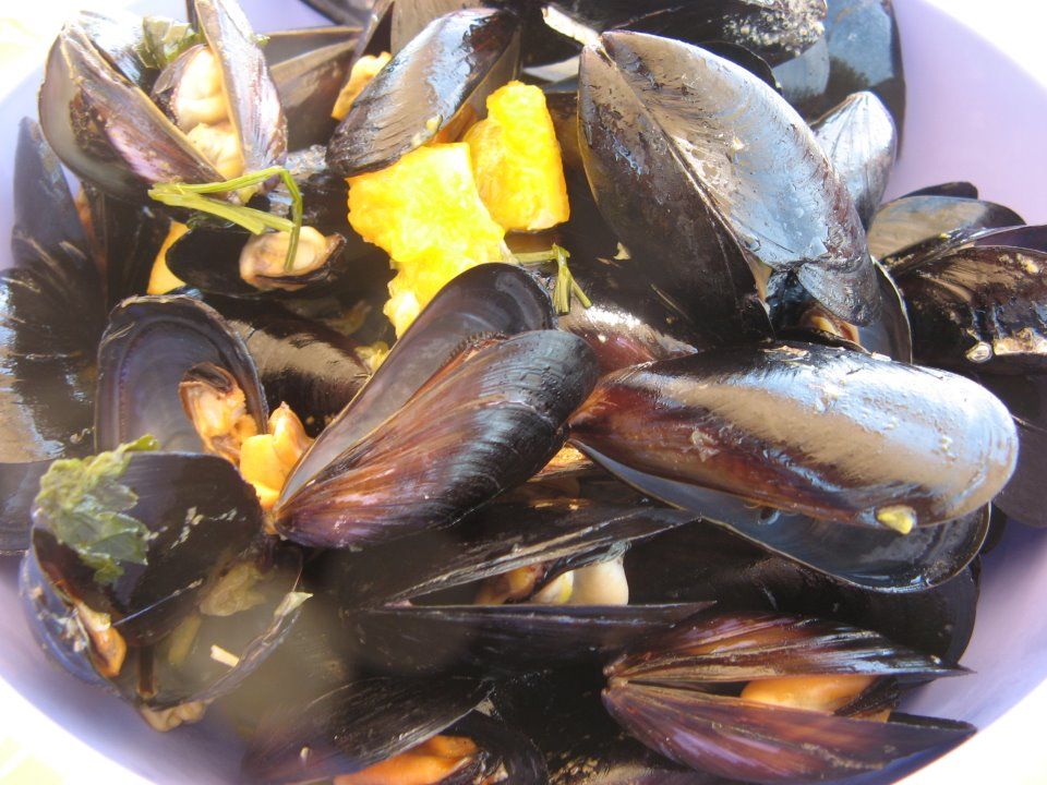 Tra una chiacchiera e l’altra si stappa una briosa bottiglia di cococciola spumante extra brut, fresco e fragrante nei suoi profumi agrumati. A tavola troveremo anche le tipiche cozze profumate all’arancia, il soutè di lupini e lo sgombro in umido.
