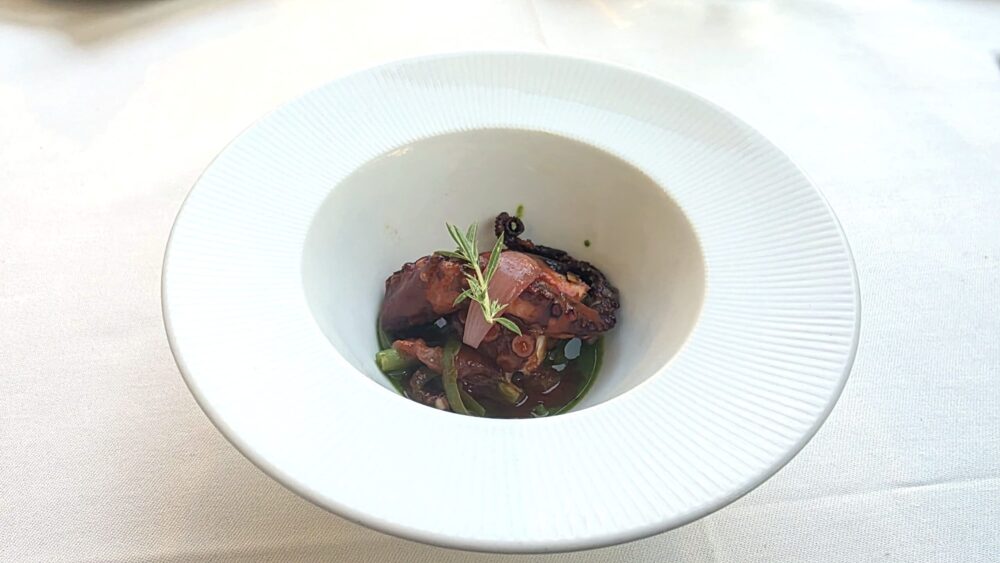 Un assaggio di polpo cotto a bassa temperatura con crema di bieta, fagiolini cornetti e cipolla in agrodolce. Abbinamento non facile ma che risulta di grande impatto gustativo. Il fagiolo cornetto e la cipolla in agrodolce, lasciati volutamente al dente, danno consistenza ad un piatto altrimenti troppo morbido. L’agrodolce ci permette di salivare e di aver quindi voglia del morso successivo.