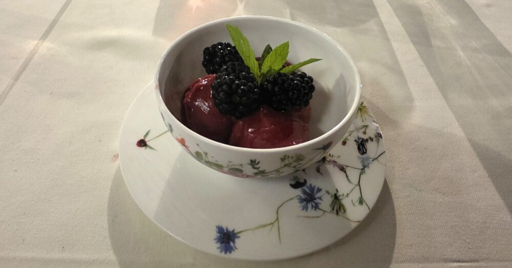 Visto le porzioni generosi, anche professionisti come noi a volte si arrendono. Terminiamo quindi in dolcezza con un sorbetto alle more provenienti dall’azienda agricola di famiglia Vaiani&Vaiani che assicura olio, frutta e verdura freschissime ai propri ristoranti. Che bontà!