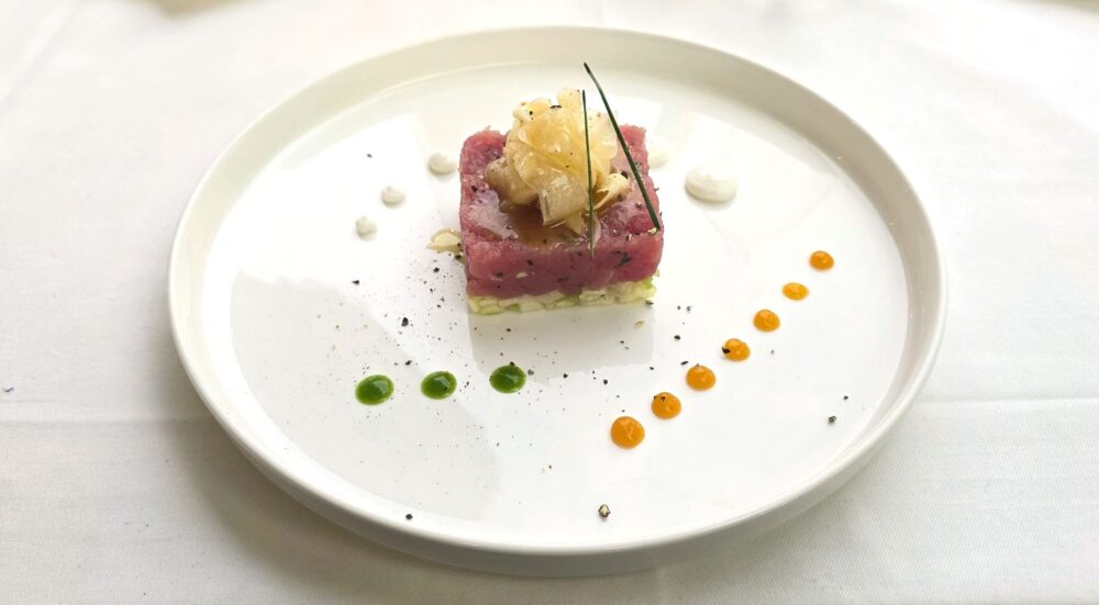 Abbiamo iniziato con una buonissima tartare di tonno con brunoise di mele e ginger. La tartare era tagliata a cubetti in modo omogeneo impreziosendo così la consistenza del tonno. Mela sotto e ginger sopra conferiscono al piatto quel tocco di freschezza che abbiamo particolarmente apprezzato.