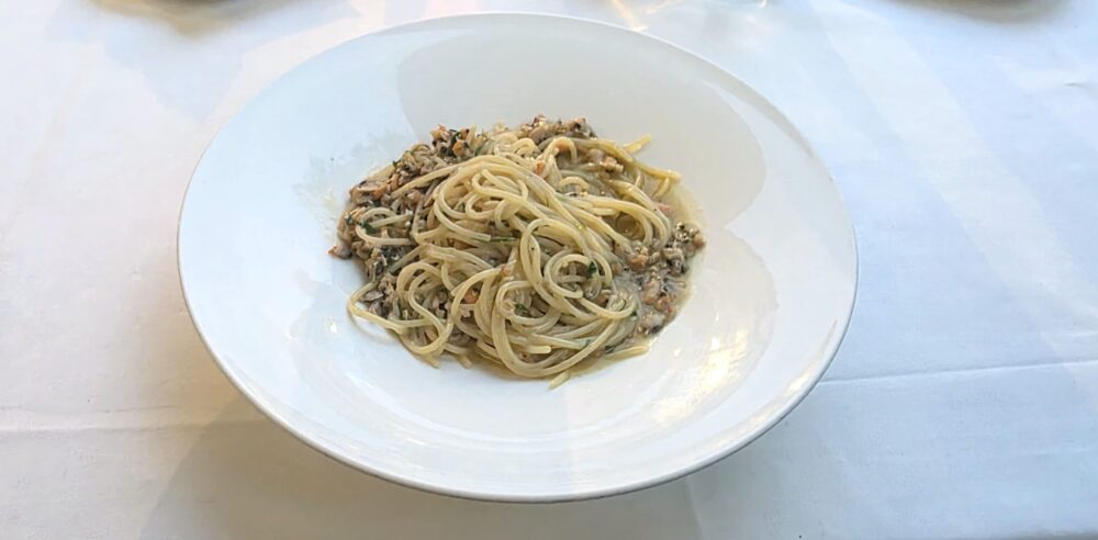 Continuiamo con un grande classico della località nella quale ci troviamo: spaghetto alle arselle. Siamo proprio nel periodo migliore per le arselle, periodo nel quale l’arsella arriva all’apice della sua carnosità e sapidità. La pasta è cotta alla perfezione e l’olio è ben calibrato nel piatto, lasciando però spazio ad una goduriosa scarpetta.