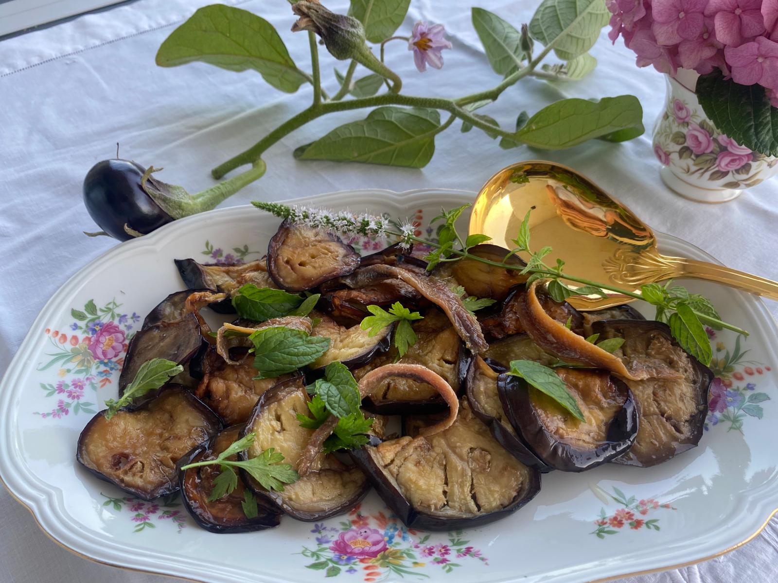 Sistemare le melanzane su un piatto ovale e tra uno strato e l’altro insaporirle con la vinaigrette agrodolce. Decorare con filetti di alici e foglioline di menta.