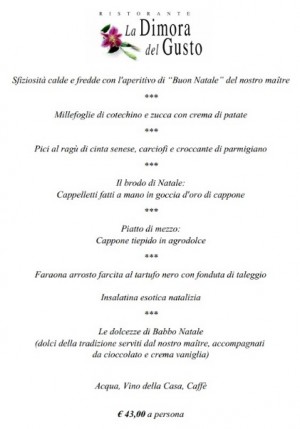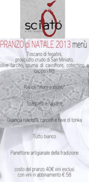 Il terzo locale lo conosco già ed è quello che ho scelto per il MIO pranzo di Natale. Non giudicherò preventivamente i piatti dal nome ma formulerò giudizi a posteriori. Qui solo il nome dei piatti. Il ristorante è lo Sciatò di Serravalle Pistoiese PT, punteggio di 15,5 sulla Guida Espresso, arredamento moderno, quadri d’autore e cucina creativa. Insieme a Atman del maestro Corelli quello dello chef Massimo Neri è il miglior locale della Valdinievole, quindi le aspettative ci sono. Prezzo di 40 euro (escluso bevande).