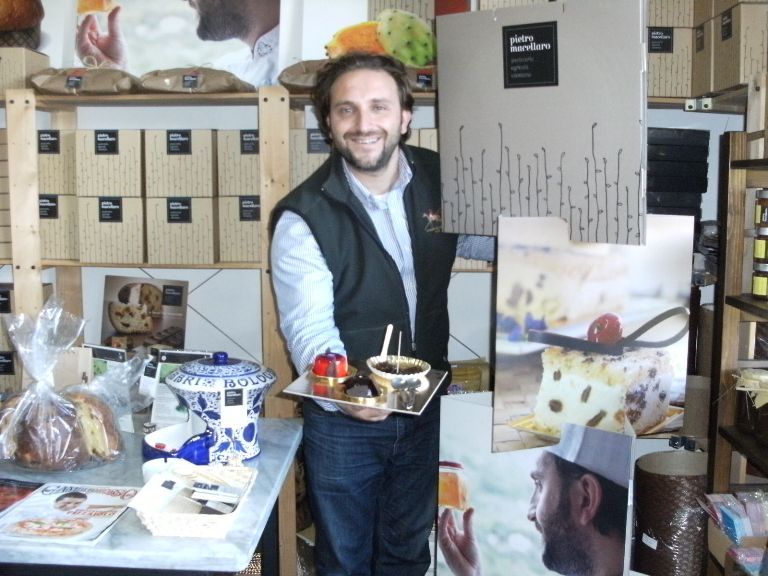 Il nostro anfitrione è un giovane di bell'aspetto, affascinante, affabulatore, di buone maniere, amante del suo lavoro e del territorio in cui opera. Si è diplomato alla “Boscolo Etoile Academy” di Sottomarina di Chioggia (Ve) nel 2006 e poi è tornato a casa per prendere possesso della pasticceria di nonno Pietro, da cui ha ereditato la passione per i dolci e le antiche ricette, situata nel pieno centro di Piaggine e da lì è poi partito lancia in resta per la sua grande avventura. Adesso il punto vendita non esiste più, ma Pietro continua a creare i suoi capolavori in un laboratorio vicino. La sua artigianale pasticceria si definisce agricola (e lui ci tiene a ribadire che è l'unica in Italia), perché la stragrande maggioranza delle materie prime proviene dalla sua azienda agricola biologica e che lui coltiva personalmente: evo, mandorle, albicocche, fichi, mele, percoche, melograni, ciliegie, castagne, frutta secca, erbe aromatiche ed altro ancora. Per il resto si serve di prodotti locali, come burro, ricotta e panna fresca provenienti da un caseificio di Paestum, farina del Cilento e nocciole di Giffoni. Solo qualche ingrediente, tipo i pistacchi di Bronte, arriva da fuori. Tutti prodotti genuini e rigorosamente esenti da grassi idrogenati vegetali, conservanti e coloranti.