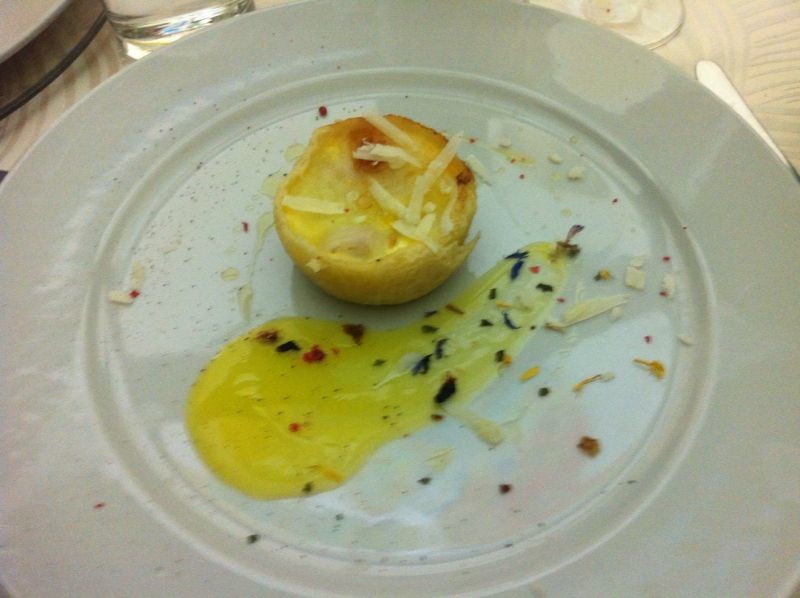 – Pasta brisè al burro di Baronia con ripieno di mozzarella, fiori di zucca e dadolata di maiale nero casertano in crema di zafferano.