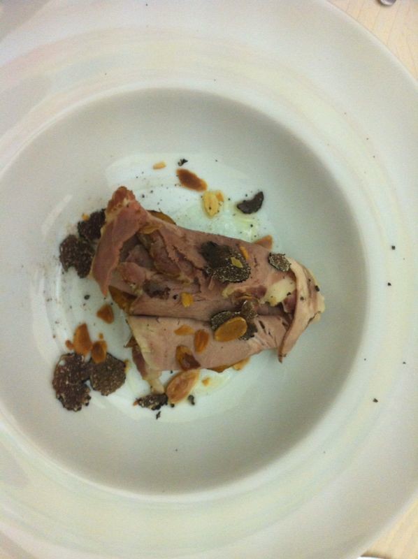 – Patata scottata con roast beef di nero casertano, tartufo estivo e mandorle tostate.