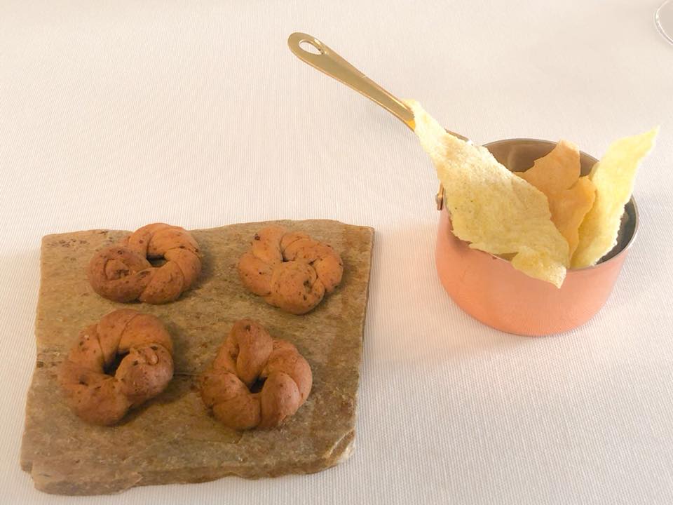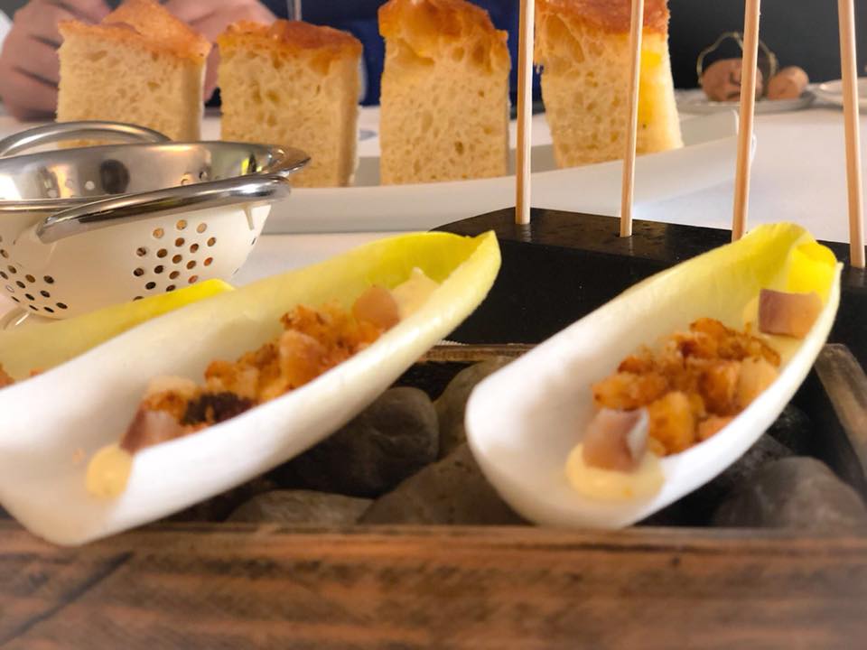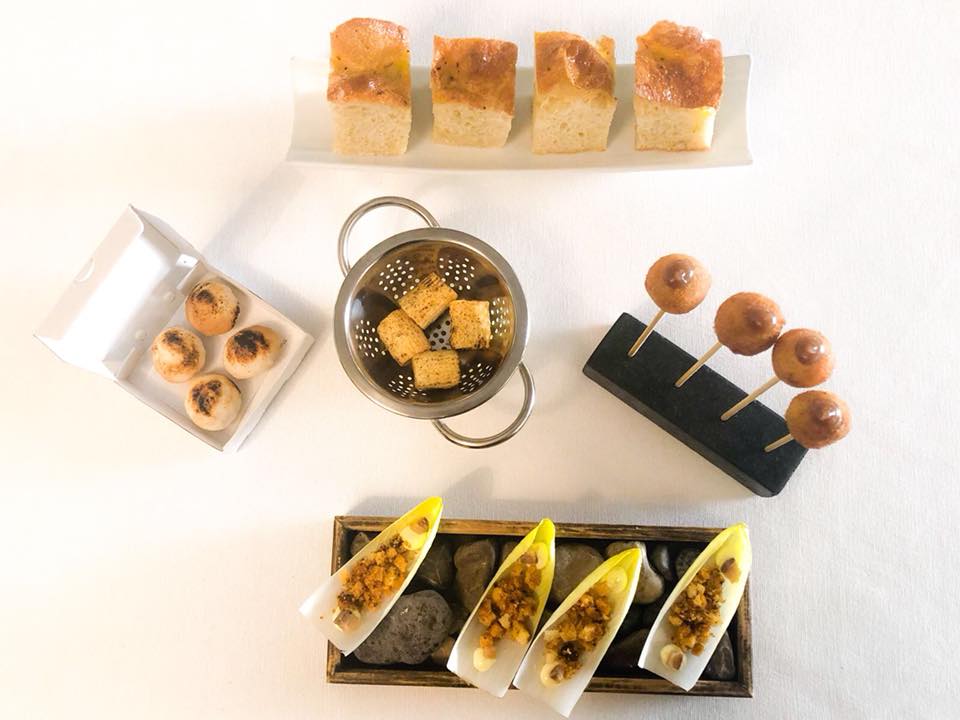 Piazzetta Milù. Aperitivo: In alto Focaccia aglio, olio e rosmarino Al centro da sx Cornicione croccante alla marinara / pasta al forno / provolone del Monaco con composta di castagne In basso: Indivia con pane croccante, maionese al limone di Sorrento e anguilla affumicata