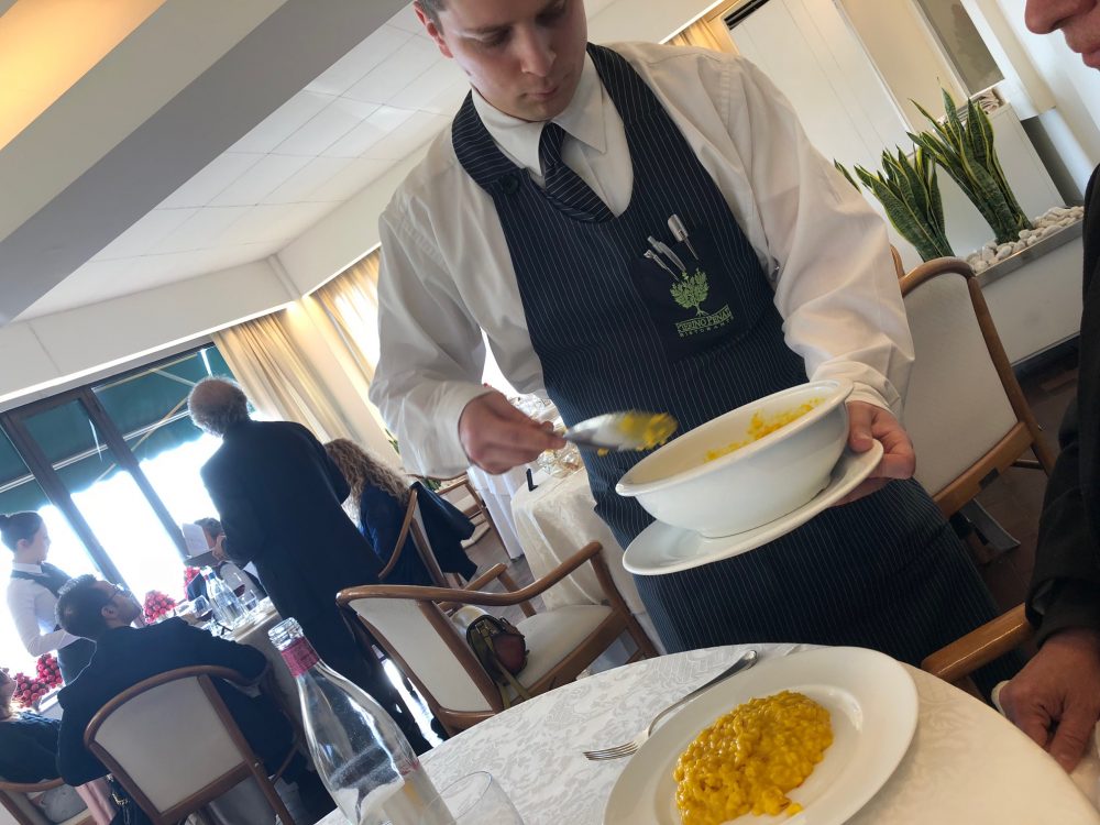 Il risotto viene portato al tavolo in una risottiera in ceramica con coperchio, viene servito, il cameriere appoggia la risottiera con il resto del risotto in un tavolo di servizio e passa successivamente per un secondo assaggio.