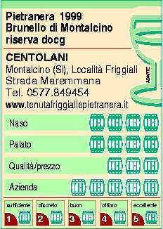 Come orientarsi allora dopo la bufera? A noi piace molto l’azienda Il Marroneto di Alessandro Mori, sempre fedele all’impostazione tradizionale e all’uso non invasivo nel legno. Ma qui vi segnaliamo anche l’agricola Centolani, una vasta tenuta di circa 200 ettari, di cui 43 a vigneto, acquistata nel 1987 da Giovanni Peluso, napoletano doc, e adesso portata avanti dalla figlia Olga. Una bandiera della buona agricoltura ilcinese, tra l’altro esempio di buona ospitalità grazie ad un agriturismo da usare come sicura base logistica se siete in giro da queste parti. La proprietà è formata da due corpi, Tenuta Friggiali e Tenuta Pietranera dove nascono i Brunello con la consulenza di Riccardo Cotarella, espressione compiuta del territorio. Non vi è dubbio di come lo scorrere del tempo sia il fattore primo per valutare lo spessore di un’azienda oltre che di un vino. Ci è capitata una magnum di Pietranera 1999, annata molto buona per i rossi italiani e dunque anche per Montalcino: in questo caso il Sangiovese esprime potenza più che eleganza, assolutamente integro, fresco, con tannini morbidi ma comunque ben presenti, tali da rendere il vino assolutamente abbinabile.