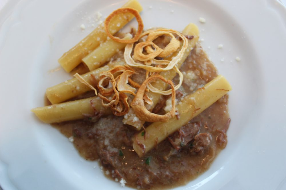Proseguendo non poteva mancare un piatto tipico napoletano, Le candele alla genovese con una piccola chicca: le cipolle disidratate come decorazione ed aggiunta di sapore al piatto.