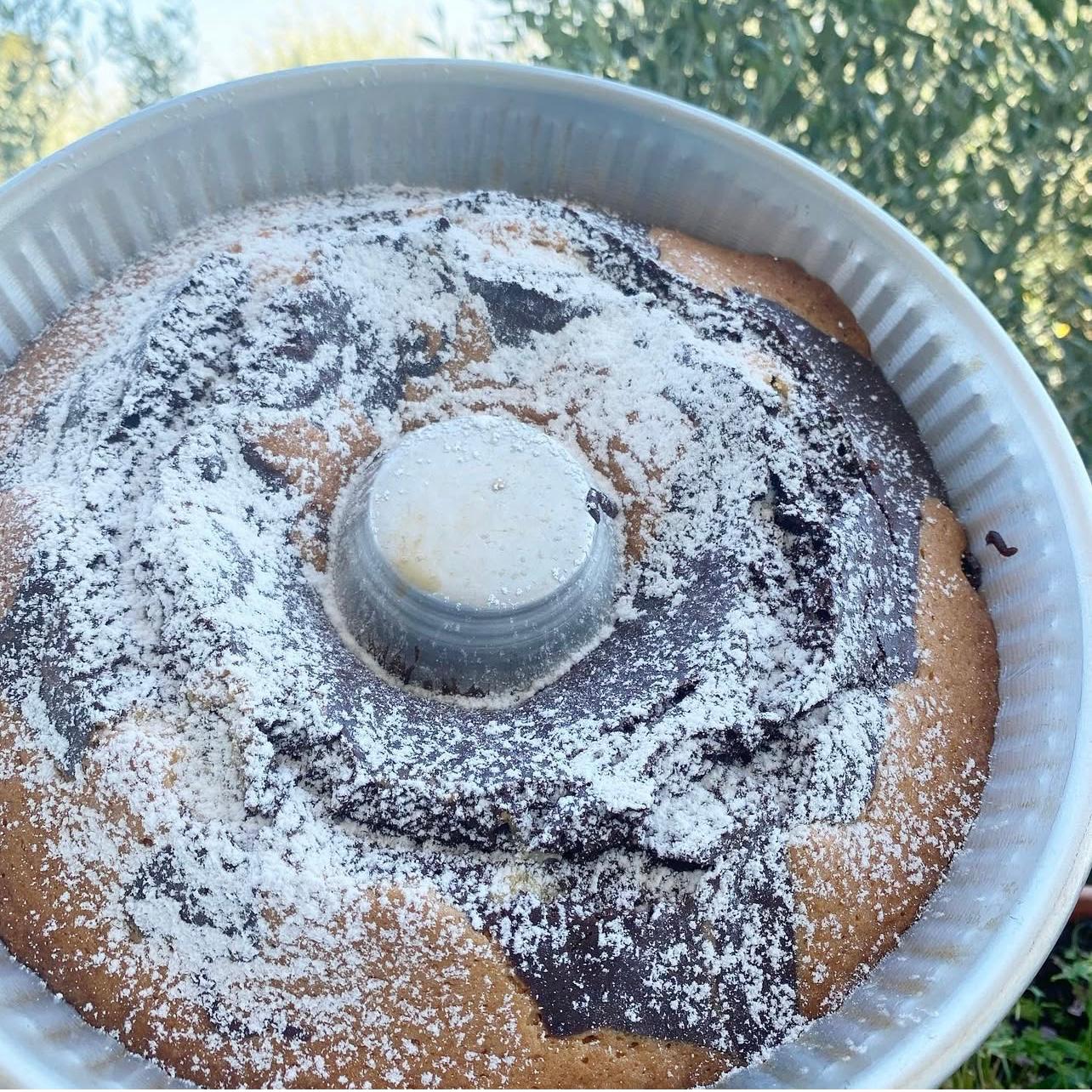Imburrare e infarinare uno stampo a ciambella medio, versarvi il composto bianco e poi, a cucchiaiate quello al cioccolato.